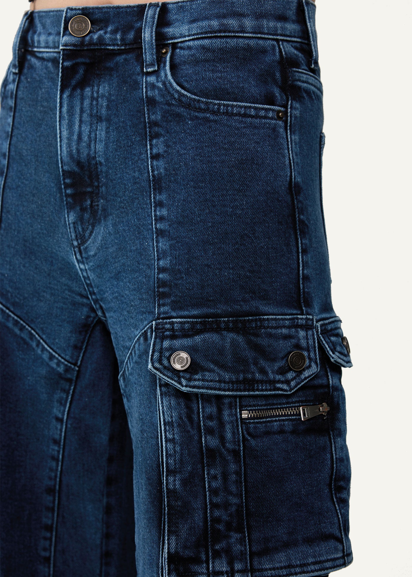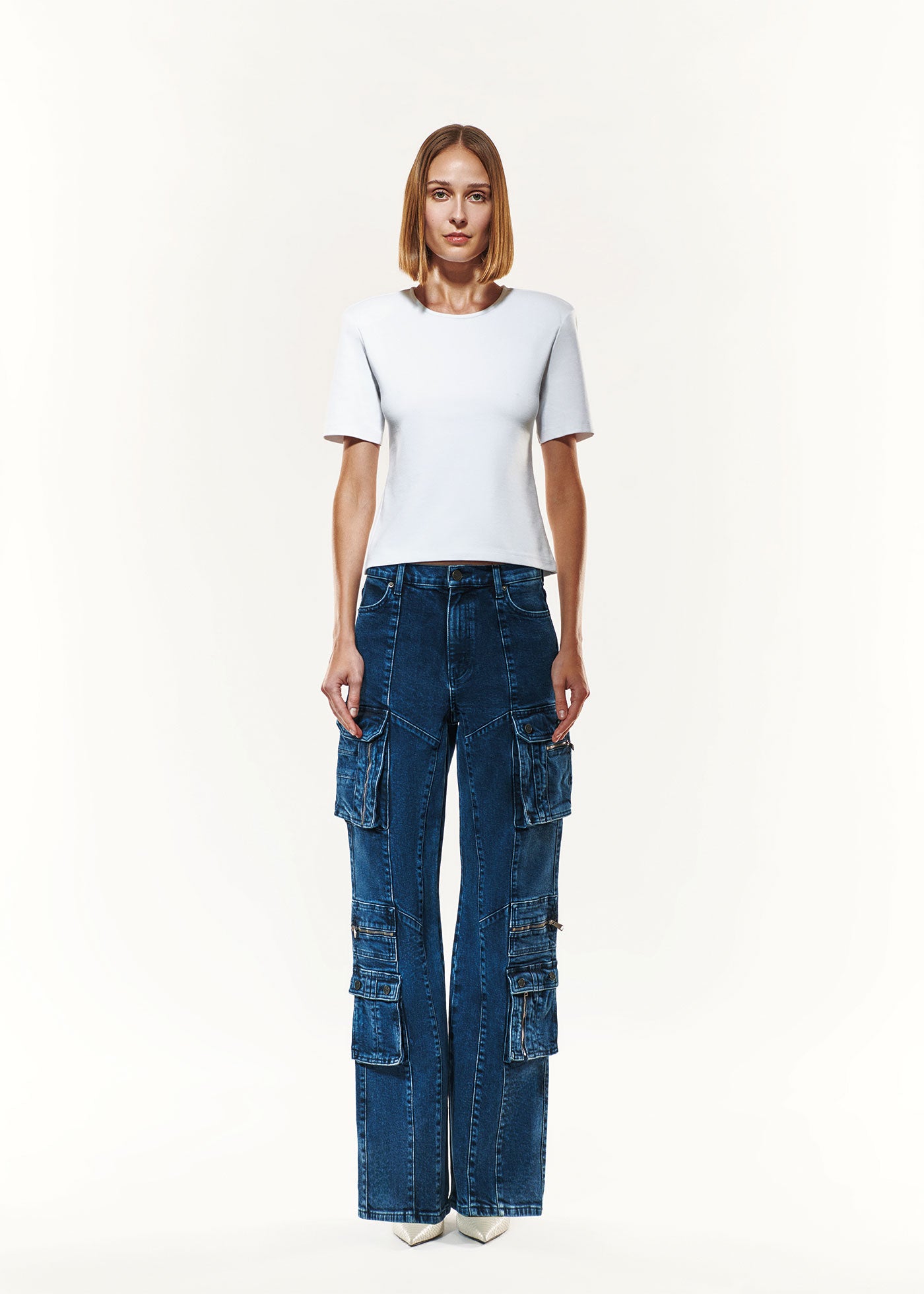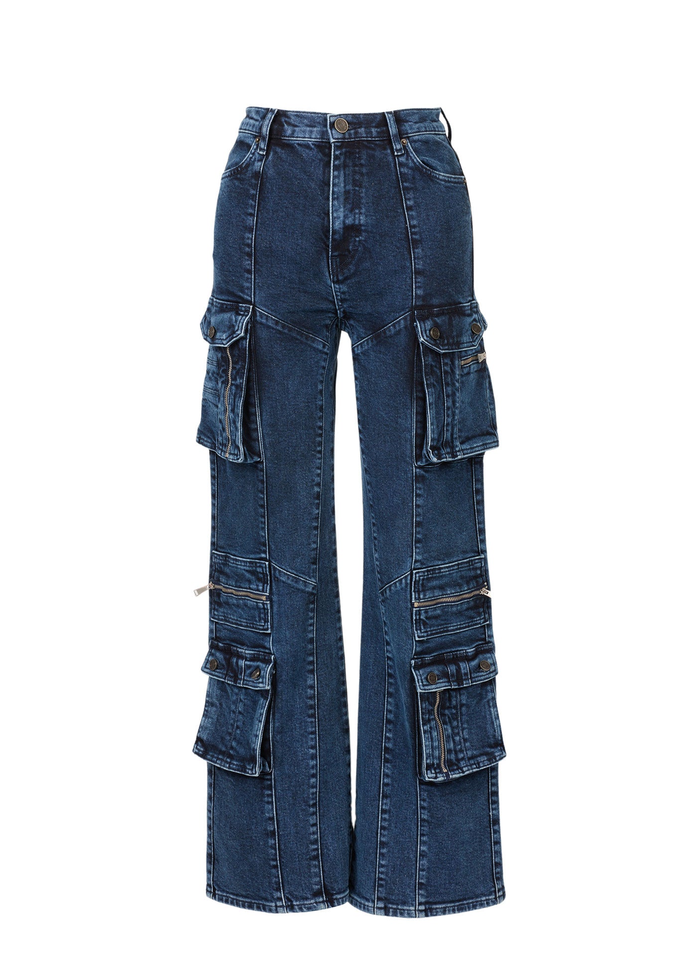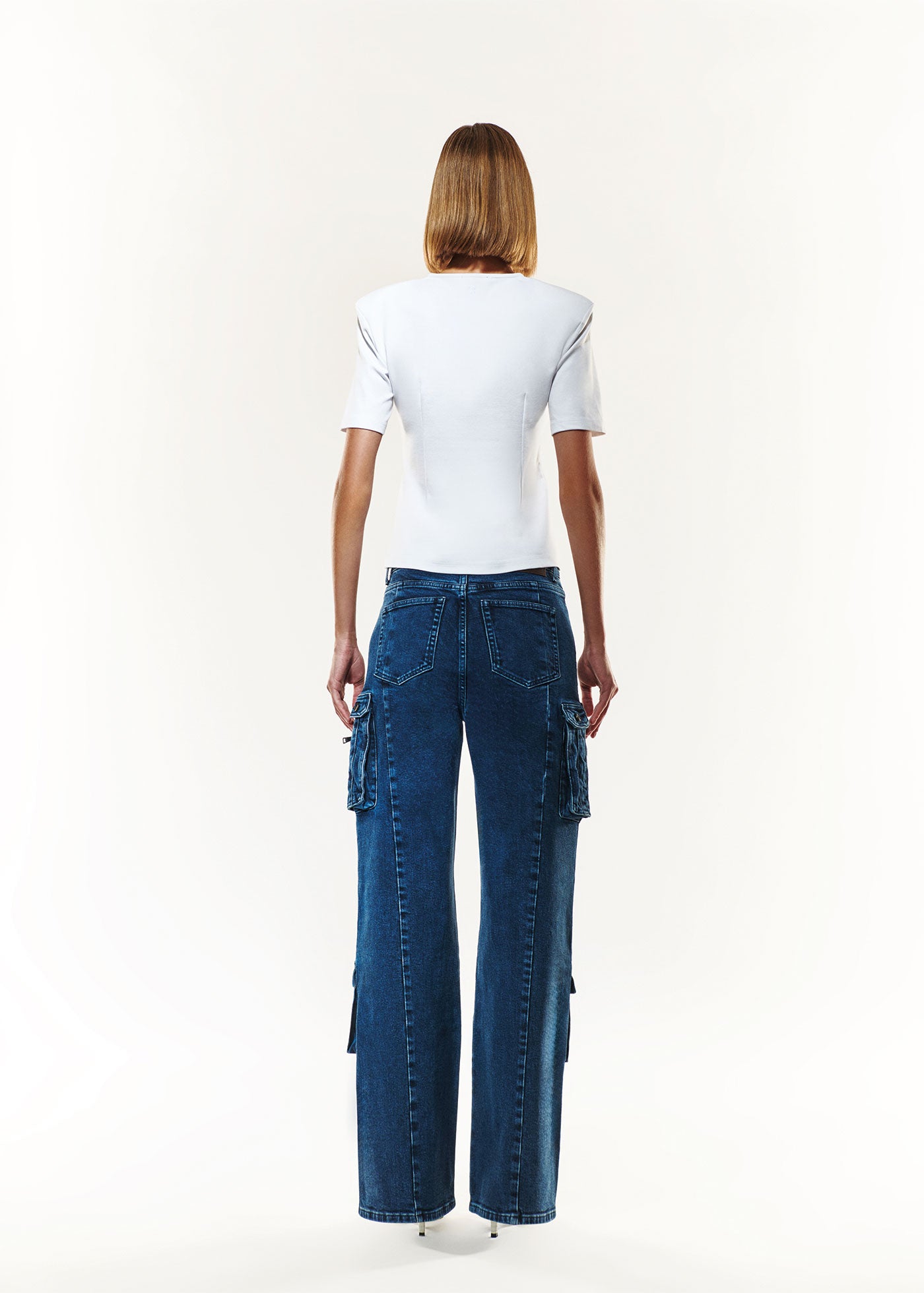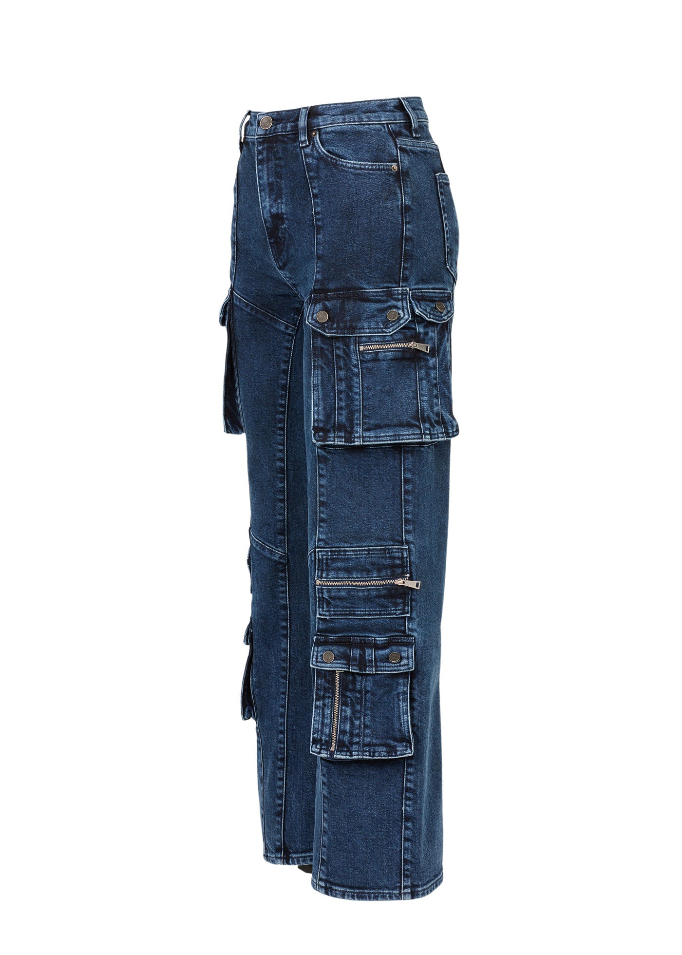 For our Alexa Cargo Jeans, we merged the chic aesthetic with the streetwear spirit which makes the perfect style to be taken from day to night. The silhouette is designed to sit high on the waist with a wide-leg, offering varied styles of multi-pockets at front and sides. Crafted from organic and recycled cotton, the dark blue wash is elevated with mineral effects for a touch of artistry.
