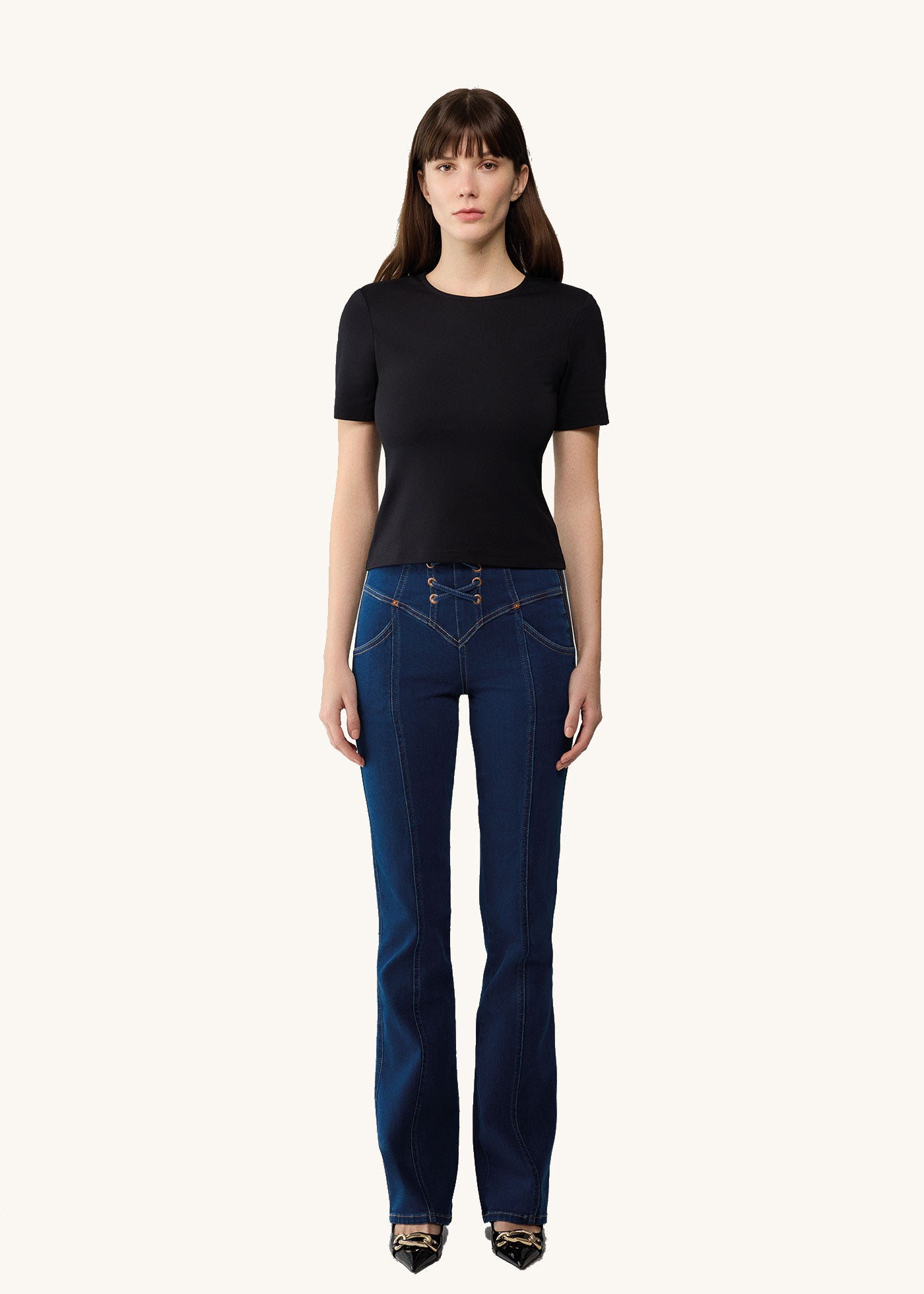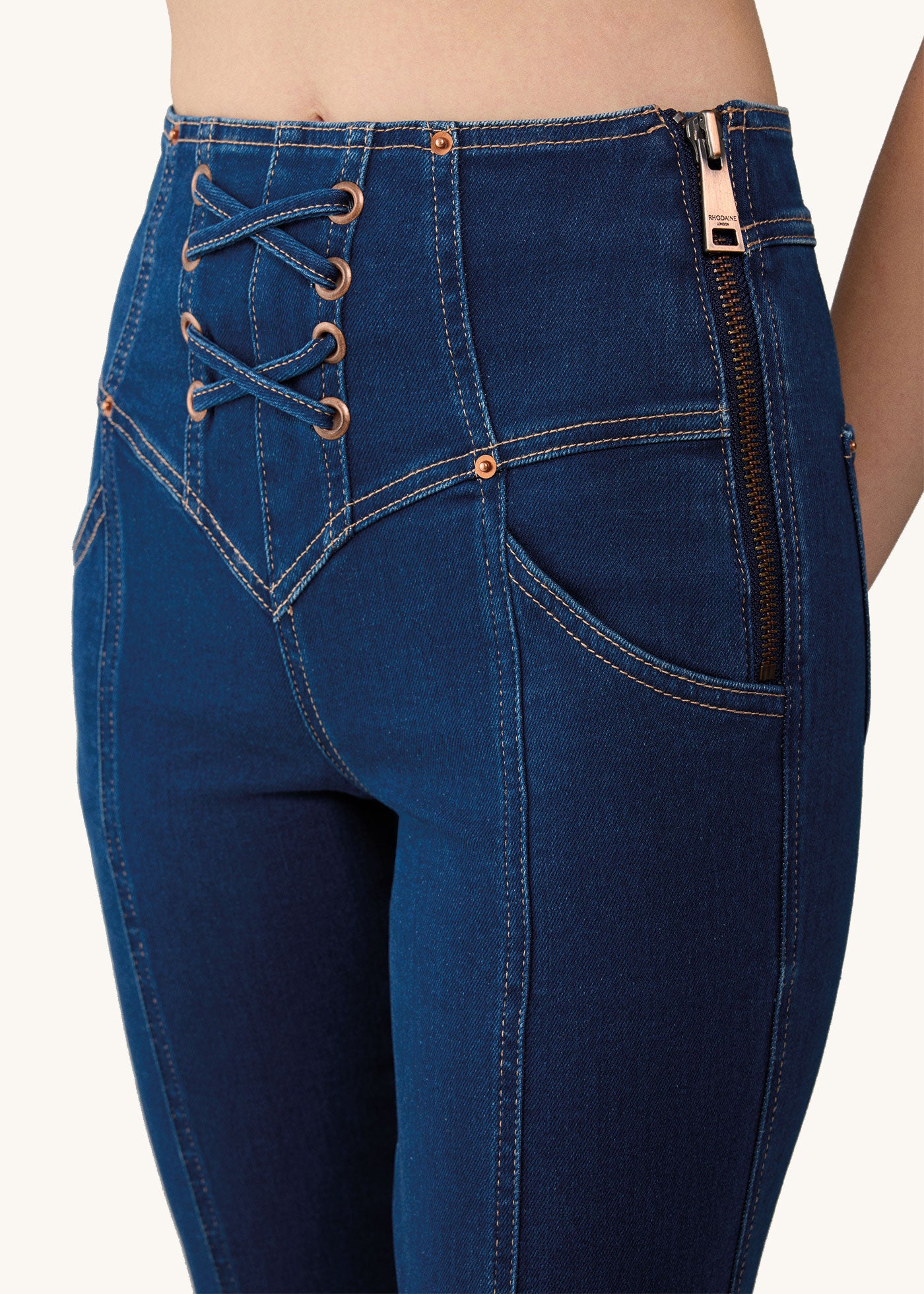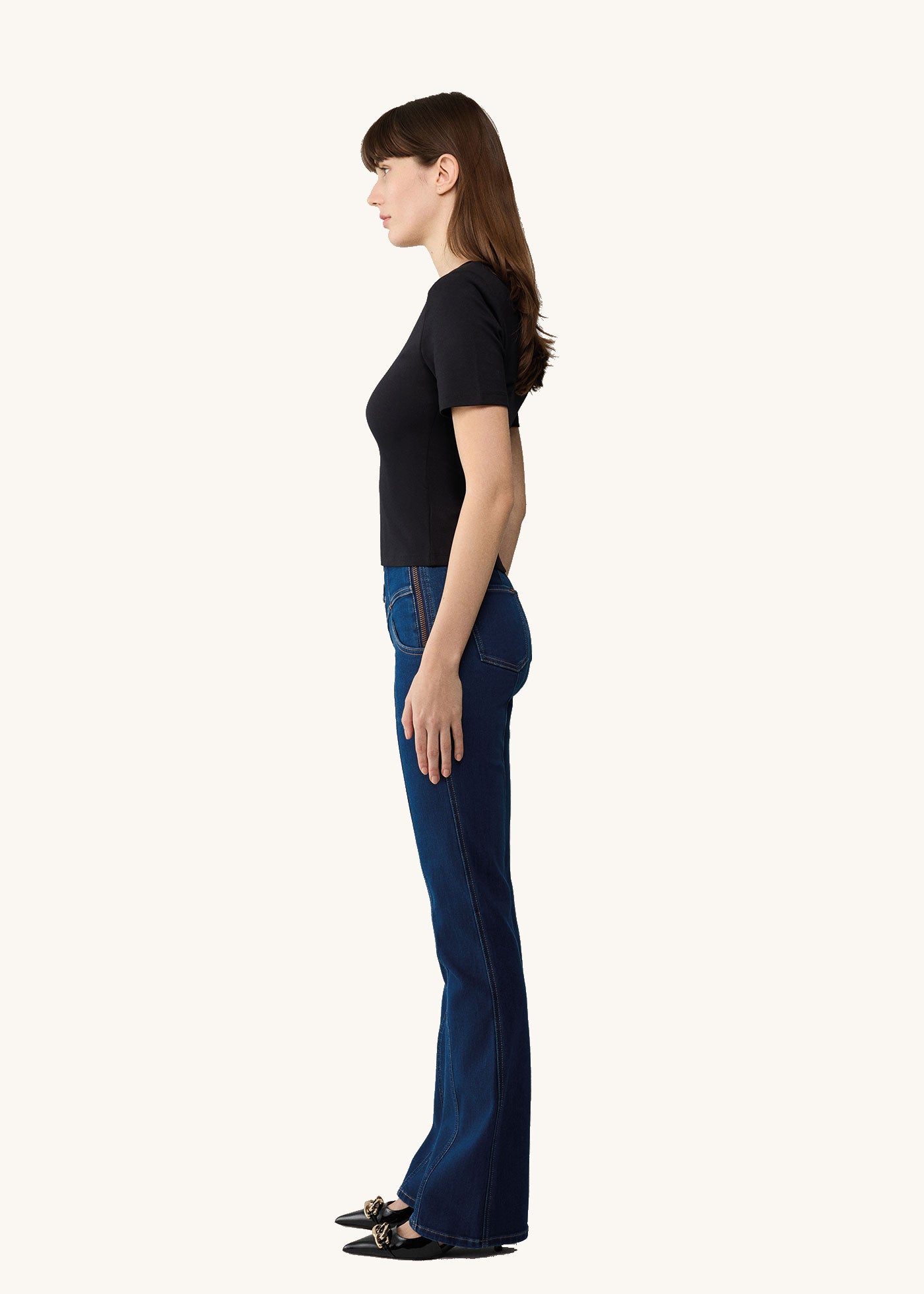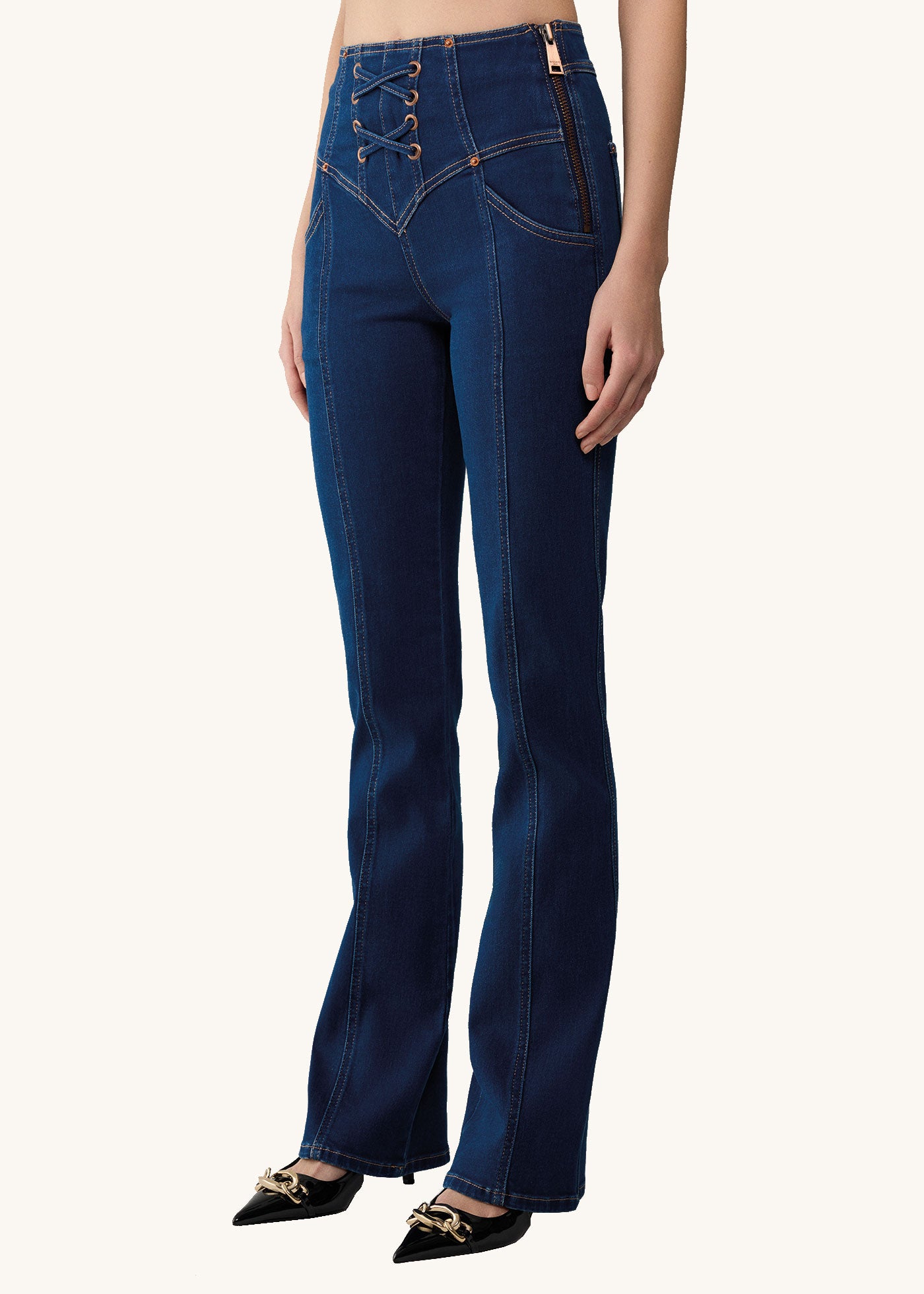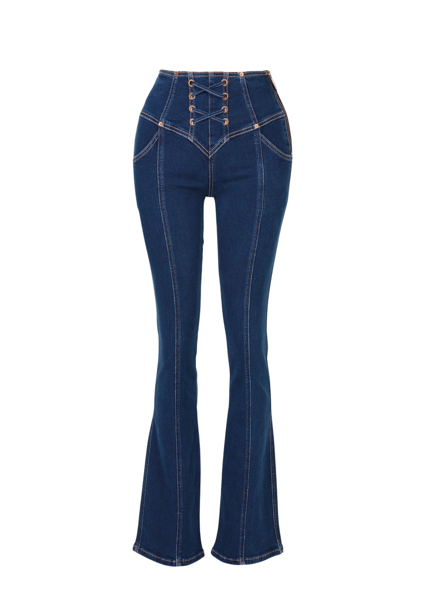 The Jodie Jeans feature a leg lengthening flare shape and a high waist. With the double eyelet detailing on the fly, the zipper on the side and unexpected stitching throughout, they are designed to stand out while still looking elegant. Crafted from a premium denim blend with the right amount of stretch, these jeans are the most comfortable ever.